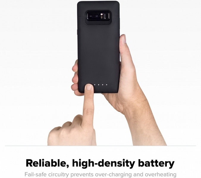 Чехол-аккумулятор Mophie Juice Pack 2950 mAh для Samsung Galaxy Note 8 Mophie Juice Pack 2950 mAh представляет собой стильный и функциональный чехол-аккумулятор для смартфона Samsung Galaxy Note 8. Встроенная в аксессуар батарея имеет высокую емкость и позволяет продлить работу коммуникатора до 33 часов. Такое решение позволит вам отправится в дорогу, не переживая о том, что вы останетесь без связи в местах, где нет доступа к энергосети. Аксессуар имеет тонкий дизайн и практически не увеличивает зрительно телефон. Чехол-аккумулятор Mophie Juice Pack плотно облегает корпус Samsung Galaxy Note 8, повторяя все его линии и изгибы. Имеет немного приподнятый профиль для дополнительной защиты экрана. Аксессуар оставляет в свободном доступе все функциональные разъемы и интерфейсы коммуникатора. К тому же, чехол способен защитить смартфон от механических повреждений и образований на поверхности его корпуса грязи. Mophie Juice Pack имеет встроенный аккумулятор емкостью 2950 мАч и обеспечивает более долгий срок службы штатной батареи Samsung Galaxy Note 8. Чехол имеет LED-индикацию, отображающую уровень заряда встроенной в него батареи. Модель поддерживает практически все виды беспроводных зарядок, а встроенные магниты позволят закреплять телефон в специальных держателях. Зарядка чехла осуществляется одновременно со смартфоном, при этом коммуникатор будет заряжаться первым.