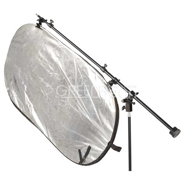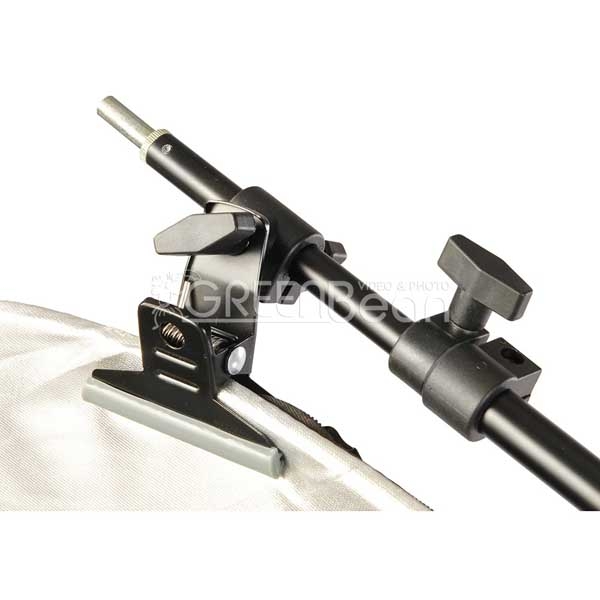 Поворотный узел крепления позволяет устанавливать его на стойки и другие опоры с посадочным диаметром 5/8" или резьбами 1/4", 3/8". При необходимости можно установить груз-противовес (входит в комплект) — для использования с тяжелыми отражателями и фонами. Надежная фиксация широкими прищепками, очень удобен для выездных съемок и работы в малогабаритных студиях.