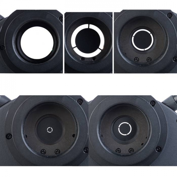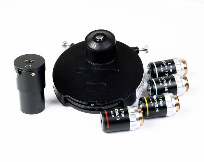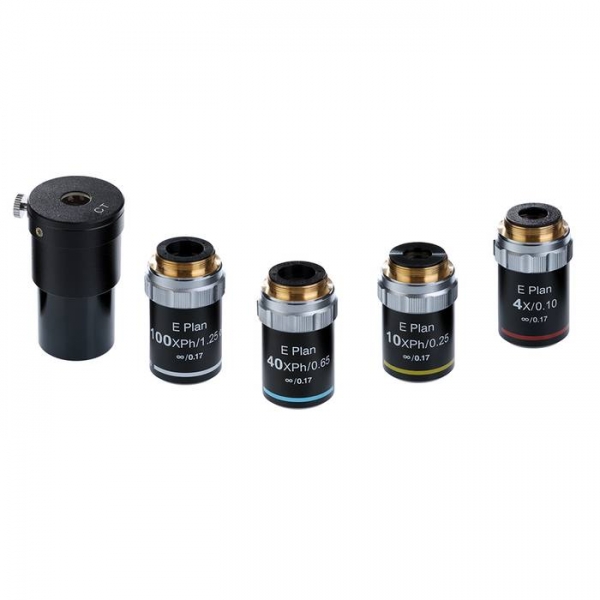 В комплект входят фазовые объективы-планахроматы 4х/0,1; 10х/0,25; 40х/0,65; 100х/1,25. Объективы рассчитаны на длину тубуса "бесконечность" и толщину покровного стекла 0,17 мм