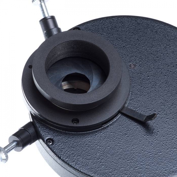 Конденсор может быть использован для наблюдения обычным способом; для этого под револьверным диском имеется ирисовая диафрагма, а в диске револьвера, кроме кольцевых диафрагм, имеется свободное отверстие для пропускания всего пучка света.