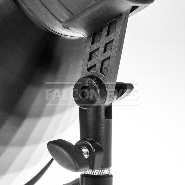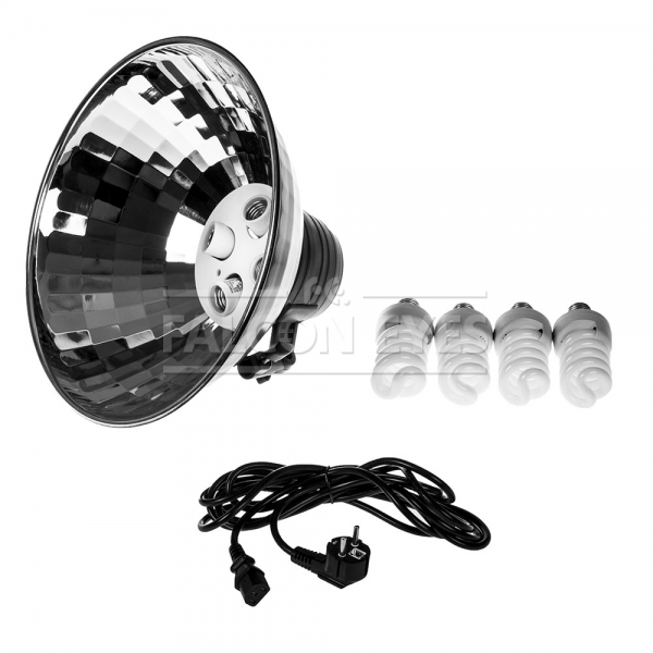 Falcon Eyes LHD-40-4 – флуоресцентный осветитель, четыре лампы со стандартным цоколем Е27, рефлектор диаметром 40 см. Преимуществом этого осветителя является низкое энергопотребление и малое тепловыделение, цветовая температура ламп из комплекта соответствует дневному свету 5500К (возможна установка флуоресцентных ламп с другой цветовой температурой). Рефлектор изготовлен из алюминия, поверхность рельефная глянцевая, для эффективного направленного светового потока. Две ступени регулировки яркости, клавиши переключения расположены на задней части осветителя. Осветитель устанавливается на стойку со стандартным креплением 5/8", кронштейн с поворотной муфтой. Рефлектор изготовлен из алюминия толщиной 0,5 мм, корпус и кронштейн из прочного пластика. В комплекте осветитель, четыре лампы по 25 Вт (5000-5500К), тканевый рассеиватель (устанавливается на рефлектор), кабель питания.