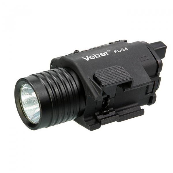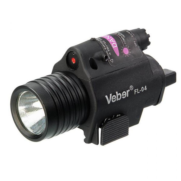 Фонарь подствольный Veber FL-04 с лазером Компактный вариант изделия по принципу 2 в 1. Корпус изготовлен из жесткого пластика, по внешнему виду и прочности даже не отличимым от силумина. Задняя крышка закрывает батарейный отсек, на ней же расположены кнопка включения и гнездо для выносной кнопки (длина шнура — 1 метр). На верхней части корпуса — ручка переключения режимов. Режимы: Выкл, лазер + фонарь, фонарь, лазер. Асферическая поверхность отражателя светодиода фонаря, формирует световой поток с ярким пятном в центре и большой периферийной зоной, что удобно для ориентировки. Оси фонаря и лазера строго параллельны (однако, предусмотрена возможность регулировки направления луча лазера), поэтому при совместном использовании, лазерная точка находится в центре светового пятна от фонаря. Крепление под Weaver. Закрепление устройства осуществляется путем нажатия на подпружиненную площадку прибора в основании корпуса. Обычное (не влагозащищенное) исполнение. Рекомендованное применение — легкая пневматика, пейнтбол, арбалеты и т. п.
