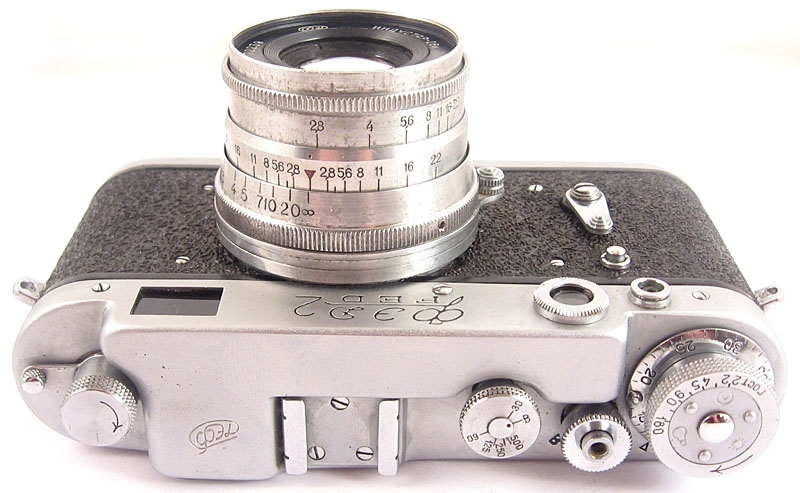 Описание:Фотоаппарат ФЭД-2 представляет собой дальномерный фотоаппарат в литом алюминиевом корпусе, снабженный оптическим дальномером, совмещенным с видоискателем. Камера рассчитана на стандартную 35-мм перфорированную пленку и формат кадра 24x36 мм. Производился Харьковским производственным машиностроительным объединением «ФЭД» с 1955 по 1970 год. Всего моделей под названием ФЭД-2 было выпущено 1632600 штук. Камера была оборудована тремя типами объективов в зависимости от года выпуска (Индустар-10 3,5/50мм, Индустар-26м 2,8/50мм или Индустар-61 2,8/52мм). Камера снабжена шторным затвором, допускающим моментальные экспозиции в пределах от 1/25 до 1/500 сек. Дальномер с большой базой облегчает наводку на резкость, особенно с длиннофокусными объективами. ФЭД-2 - это универсальный фотоаппарат, применяемый для всех видов съемки - как моментальной, так и с выдержкой (со штативом). Главным отличием ФЭД-2 от ФЭД-1 является съемная задняя стенка и совмещение дальномера и видоискателя. В видоискателе добавлена диоптрийная поправка, а база дальномера увеличена. Для зарядки камеры открывается задняя стенка. Для съемки могут применяться как стандартные одноцилиндровые кассеты, так и двухцилиндровые. Конструкция фотоаппарата позволяет применять сменные объективы и подключать импульсные лампы-вспышки. Механизм возврата пленки позволяет перезарядить камеру при обычном неярком свете. Характеристики: