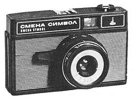 Фотоаппарат Смена Символ - относится к семейству советских шкальных фотоаппаратов, выпускавшихся объединением ЛОМО в 1971—1991 годах. Камера имеет пластмассовый корпус с открывающейся задней стенкой, самосбрасывающийся счетчик кадров, совмещенный курковый взвод затвора и перемотки пленки. Работа с пленкой, как и на предыдущих моделях, организована при помощи приёмной несъёмной катушки, съёмка в пустую кассету невозможна. Отличительной особенностью данной модели является наличие спусковой клавиши, расположенной рядом с оправой объектива на передней стенке камеры. Кроме того видоискатель данной модели оптический, состоящий из двух пластмассовых линз, на шкале расстояний, кроме метровых меток, нанесены символы «Портрет», «Групповой портрет», «Пейзаж».
