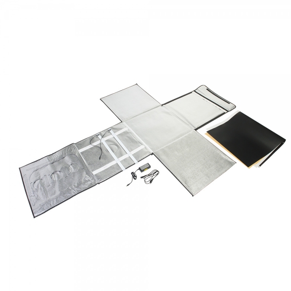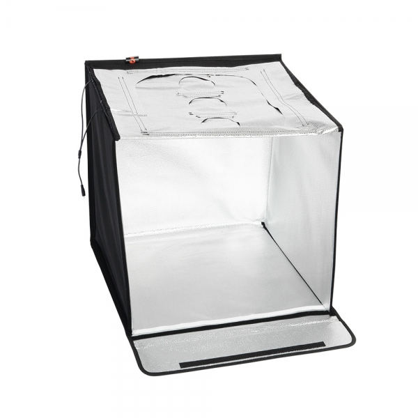 Фотобокс Falcon Eyes Light Cube 60 LED со светодиодным освещением Falcon Eyes Light Cube 60 LED - автономная мини-студия для фотографирования небольших и средних объектов, внутренний размер фотобокса 60х60х60 см. Используется в предметной съемке для печатных каталогов, интернет-магазинов, Конструкция разворачивается в квадратный легкий фотобокс и оборудована своим собственным источника света с цветовой температурой 5500К. Внутренние серебристые текстурированные стенки равномерно заполняют куб отраженным светом от двух светодиодных линеек (по 44 светодиода на каждой). Светодиодные линейки установлены на верхней крышке фотобокса, их можно легко переместить вдоль крышки благодаря системе липких лент (велкро). Монтаж конструкции осуществляется также с помощью липких лент, расположенных по периметру стенок. В сложенном виде фотобокс занимает мало места, складывается в кейс с ручкой. Light Cube 60 LED имеет откидную переднюю панель со встроенным съемочным окном 37х48 см и тремя отверстиями диаметром 11 см, а также верхний люк диаметром 12 см для съемки с верхнего ракурса. Фотобокс поставляется с черным, белым и оранжевым пластиковыми фонами для размещения разных цветных предметов.