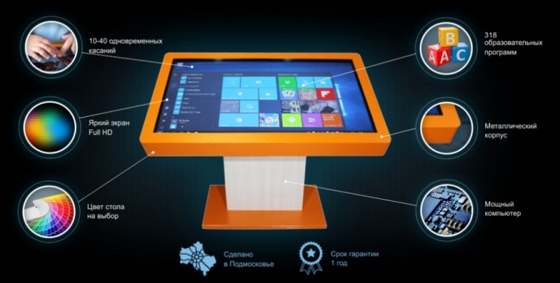 Интерактивный стол Project touch 50 Интерактивный наклонный стол Project touch 50. Металлический корпус, Full HD разрешение (1920х1080), диагональ 50" (125 см), поддержка 10 касаний одновременно. Встроенный компьютер с процессором Core i3, оперативной памятью 4 Gb и жестким Интерактивный стол Project touch 50 создан в России, имеет металлический корпус без острых углов, специально для школ и других образовательных, и не только, учреждений. Диагональ дисплея составляет 125 см, такой большой размер позволяет нескольким пользователям, взаимодействовать со столом, не мешая друг другу. Интерактивный стол Project touch 50 имеет встроенный компьютер с установленным набором обучающих игр и акустику суммарной мощностью 20 Вт. Режим мультитач поддерживает 10 касаний одновременно. На боковой панели имеются два выхода USB 3.0. Металлический корпус, ко всему прочему, является ударостойкий, стекло ударопрочное. Корпус не имеет острых углов и является травмобезопасным, устойчивым к различного рода повреждениям. Цвет корпуса можно выбрать из более чем 180 вариантов! Наклонный механизм стойки позволяет наклонять стол в пределах 25 градусов.