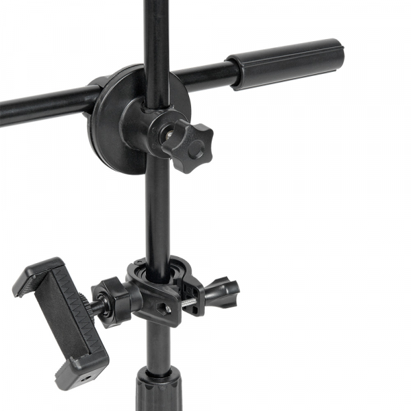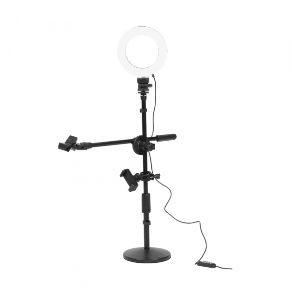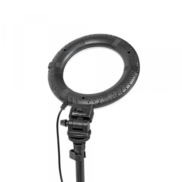 Комплект оборудования Falcon Eyes BloggerKit 16 для видеосъемки Комплект оборудования Falcon Eyes BloggerKit 16 для предназначен для быстрой организации видеосъёмки или трансляции с помощью камеры смартфона. Кольцевой осветитель Комплектный бестеневой кольцевой осветитель установлен на телескопическую штангу через наклонно-поворотный кронштейн и подключается к любому источнику питания с портом USB. Осветитель снабжен регулировкой яркости и цветовой температуры. Внешний диаметр осветителя — 165 мм. Внутренний диаметр кольца — 110 мм. Количество светодиодов — 72 шт. Высота центральной штанги для осветителя регулируется от 39 до 52 см и фиксируется цанговым зажимом. Для фиксации кабеля питания на стойке предусмотрены две пластиковых клипсы. Адаптер для смартфона Для установки смартфона в комплекте предусмотрен адаптер. В него можно установить смартфон шириной от 58 мм до 87 мм. Смартфон надёжно фиксируется подпружиненной лапкой адаптера. Адаптер имеет две закладных гайки с резьбой 1/4“ и крепится к центральной стойке с помощью клипсы с винтовой фиксацией. Адаптер для микрофона Для записи или трансляции звука, вы можете установить микрофон в комплектный адаптер на горизонтальной штанге. Адаптер на штанге крепится на резьбе 3/8“. Длина штанги 36 см. Горизонтальная штанга фиксируется винтовым прижимом в муфте и может регулироваться в горизонтальной плоскости. Расположение муфты на центральной стойке регулируется. Массивное основание Центральная штанга с установленным осветителем, адаптером для смартфона и горизонтальной штангой с адаптером для микрофона крепятся на массивном круглом основании. На нижней стороне основания предусмотрена противоскользящая накладка из вспененного материала, которая убережёт, в том числе, стол от возможных царапин. Купить комплект Falcon Eyes BloggerKit 16 для видеосъемки или LIVE трансляции советуем как блоггерам новичкам и заядлым любителям, так и профессионалам.