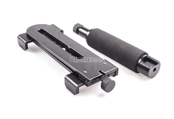 Очень популярная модель кронштейна для DSLR камер, используемая в экшн-съемках. Все элементы конструкции сделаны из металла, ручка обтянута поролоном, при эксплуатации не вращается. Имеет крепление «холодный башмак» для вспышки, микрофона, LED-осветителя и пр. Конструкция разборная, складная. Площадка для камеры имеет 8 отверстий 1/4 дюйма и 1 отверстие 3/8 дюйма, что позволяет с помощью крепежного винта найти наиболее правильное положение камеры на кронштейне, а также закрепить дополнительное оборудование, или установить всю конструкцию на штативе.