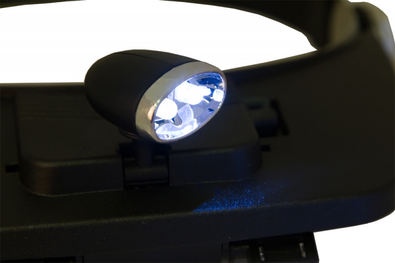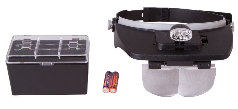 Лупа налобная Levenhuk Zeno Vizor H3 Налобная лупа Levenhuk Zeno Vizor H3 комплектуется сменными линзами. Линзы имеют увеличения в диапазоне от 1,2 до 3,5 крат. При необходимости можно комбинировать линзы, устанавливая их парами. Лупа имеет встроенную светодиодную подсветку, яркости которой хватает для отличного освещения рабочей области даже в полной темноте. Лупу Levenhuk Zeno Vizor H3 удобно использовать при проведении любых профессиональных или домашних работ с мелкими предметами. Фиксируя ее на голове с помощью обруча, вы оставляете свои руки полностью свободными. Вы сможете заниматься рукоделием, изучать механизмы часов, паять электронные платы или работать с масштабными моделями. Все линзы лупы изготовлены из оптического пластика. Они не искажают цвета и детали, позволяют видеть четкие контуры предметов. Подсветка работает от батареек типа ААА, которые входят в комплект.