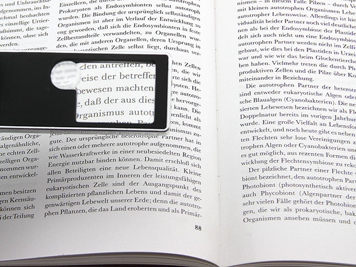 Кратность увеличения линзы - 3x, на поверхности линзы находится «пятачок» диаметром 14 мм с увеличением 8x. Подсветка — два светодиода. Батарейки и чехол в комплекте. Технические характеристики Увеличение, крат: 3-8 Размер линзы, мм: 38x31 Диаметр дополнительной линзы, мм: 14 Материал линзы: пластик Материал корпуса: пластик Габаритные размеры, мм: 92x40x7 Вес, г: 42 |