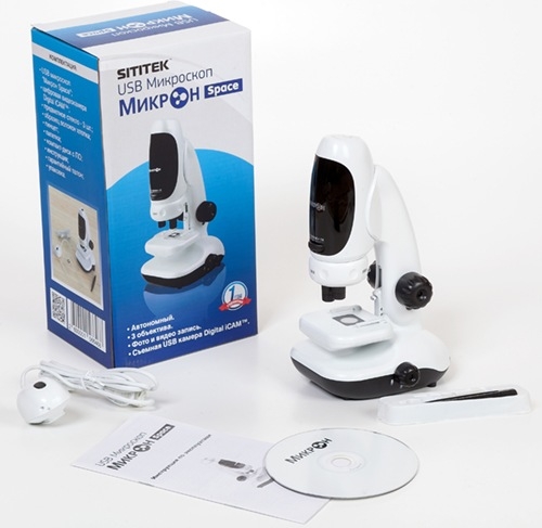 Это не полный перечень достоинств данного USB-микроскопа. Он, как и многие другие цифровые микроскопы, оборудован камерой для фотографирования предметов, увеличенных в десятки или сотни раз. Также в комплекте с микроскопом поставляются некоторые принадлежности, которые просто обязаны быть под рукой исследователя микромира. Однако главная особенность этой модели состоит в том, что его камера сделана съемной — можно в любой момент снять ее и посмотреть на интересующий Вас объект "своими глазами" через встроенный окуляр. Кроме того, основной блок (с камерой или без) можно снять со штатива и использовать отдельно. Это позволяет применять микроскоп SITITEK "Микрон Space" 1,3 Mpix (400 x Zoom) для изучения крупных предметов, например, антиквариата, картин, растений, животных и т.п. То есть, при желании Вы можете превратить SITITEK "Микрон Space" в обыкновенный цифровой микроскоп или в биологический. Кому микроскоп SITITEK "Микрон Space" 1,3 Mpix (400 x Zoom) пригодится в первую очередь?Мы рекомендуем приобретать этот микроскоп: