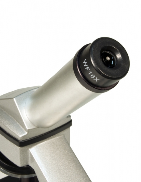 Окулярная насадка микроскопа наклонена к вертикали на угол 45° – это обеспечивает максимальное удобство использования, наблюдатель меньше устает при работе с микроскопом. Кроме того окулярная насадка вращается на 360° - это дает возможность подобрать удобное положение окуляра, не передвигая микроскоп по столу. Для удобства окулярная насадка может фиксироваться в любом положении.