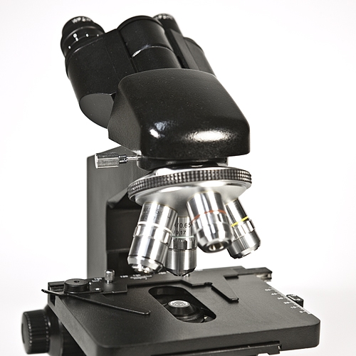 Оснащен поворотной (360º) бинокулярной насадкой, с углом наклона в 30º. 4 объектива легко установить в рабочее положение с помощью револьверного механизма. Классический (по Келеру) тип освещения имеет возможность регулировки апертурной и полевой диафрагм.