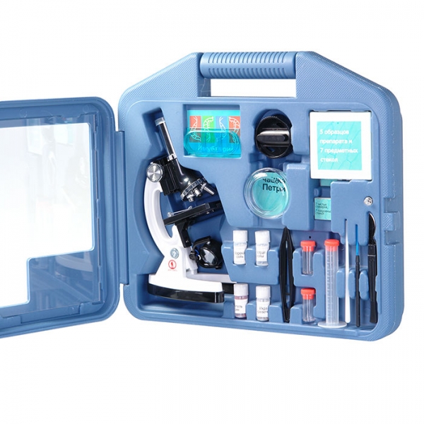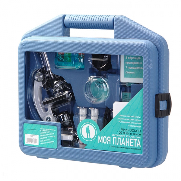 С этим набором юный исследователь откроет для себя много нового и неизвестного, получит ответы на интересующие его вопросы. Например, как выглядит ужасная и прожорливая плесень, которая, как оказалось, является грибом, клетки крови, кристаллы (соль, сахар) и другое. Прочный металлический корпус с устойчивым основанием обеспечивает максимальное удобство и эффективность работы даже в поездке – сделав новое открытие, наблюдатель может поделиться им со своими коллегами или родителями, при этом фокусировка не собьется и подстройка не потребуется. Кратность увеличения меняется поворотом револьверного устройства: 100х, 400х и 900х. На предметном столике прибора предусмотрены удобные зажимы для фиксации рассматриваемых препаратов или образцов.