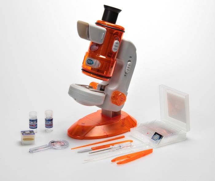 Этот детский обучающий микроскоп, очень удобный в реальном использовании. Препараты можно изучать глядя в оптический окуляр микроскопа. А можно с помощью переключателя (справа на тубусе) переводить изображение на экран размером 30×30 мм. Если батарейки свежие (2 шт., тип АА, в комплект не входят), то картинка получается яркая и четкая. Рассматривайте объект вместе и обсуждайте. С помощью экрана легко отцентрировать изображение на предметном столике. Чтобы удобнее это сделать, весь тубус наклоняется назад (3 фиксированных положения). Смена увеличений (100х, 200х и 300х) осуществляется поворотом колесика. В комплекте все необходимые инструменты и масса препаратов, поэтому после покупки сразу можно приступить к серьезной работе. Комплектация Микроскоп 100х, 200х, 300х - 1 Покровное стекло - 36 Чистый стикер - 36 Предметное стекло - 10 Предметное стекло с препаратом - 2 Покровный стикер - 36 Колба для препаратов - 2 Лупа - 1 Пинцет - 1 Крестовая отвертка - 1 Пипетка - 1 Пластмассовая спица - 1 Скальпель - 1 Инструкция на русском языке - 1 Бонус – лупа с увеличением 3х - 1 |