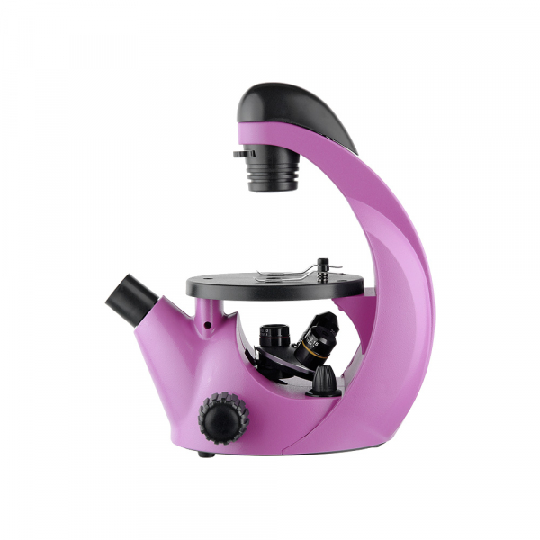 Основное отличие инвертированных (перевернутых) микроскопов от прямых в том, что объективы расположены снизу под объектом наблюдения, а осветительный конденсор сверху. Такая конструкция микроскопа значительно расширяет возможности проведения научных исследований. Можно исследовать биологические объекты зафиксированные на предметном стекле, изучать биокультуры непосредственно в стеклянной лабораторной посуде с питательной средой, наблюдая за развитием культур через стеклянное дно посуды, наблюдать результаты химических реакции в стеклянной лабораторной посуде (чашки Петри, колбы). Микроскоп можно применять при проведении школьных лабораторных работ в области ботаники, биологии и химии. Так же это идеальный инструмент для проведения исследований в домашних условиях и может стать отличным подарком ребенку.