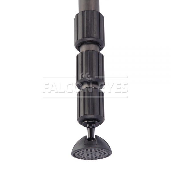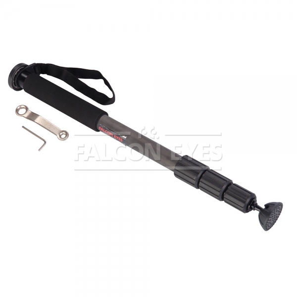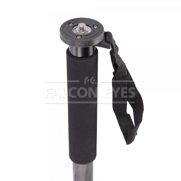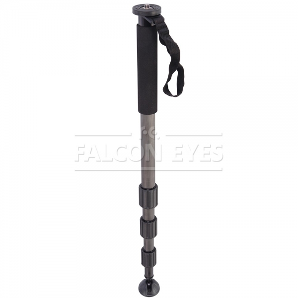 Falcon Eyes MP Возможна установка штативной головы с установочной резьбой 3/8" или 1/4", диаметр площадки под штативную головку — 50 мм. Рекомендуется устанавливать на монопод штативные шаровые головы серии BH. Четыре секции монопода обеспечивают широкий диапазон регулировки рабочей высоты. Максимальная высота в рабочем состоянии 155 см. Достаточно компактный в сложенном виде — 54 см. Монопод изготовлен из карбона и весит всего 0,45 кг. Карбоновый монопод обладает рядом уникальных свойств — он прочнее и долговечнее алюминиевых аналогов и при этом обладает меньшей массой. Большой диаметр секций (диаметр верхней секции 28 мм) и надежные цанговые зажимы успешно гасят передающиеся по корпусу вибрации и сохраняют прочность конструкции. Металлические зажимы с фторпластовыми прокладками обеспечивают долговечность работы и прочную фиксацию секций.