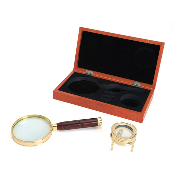 Набор луп Celestron Ambassador Элегантный набор из двух луп в оригинальных дизайнерских оправах в красивой коробке из красного дерева. Этот комплект замечательно впишется в интерьер на рабочем столе в вашем офисе или дома. 90-мм лупа имеет увеличение 2х и заключена в оправу из латуни с деревянной ручкой, а настольная лупа имеет увеличение 4 крата и заключена в дизайнерскую оправу-подставку. Этот набор особенно подходит для любителей марок. Особенности