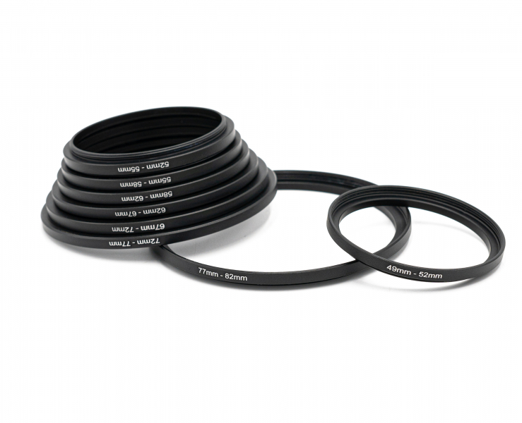 Набор повышающих колец 49-52-55-58-62-67-72-77 Набор повышающих step-up колец позволяет использовать фильтры, бленды и другие аксессуары с резьбовым креплением большего диаметра, чем у объектива. Кольца можно компоновать друг с другом для получения нужного диаметра. Материал: алюминий