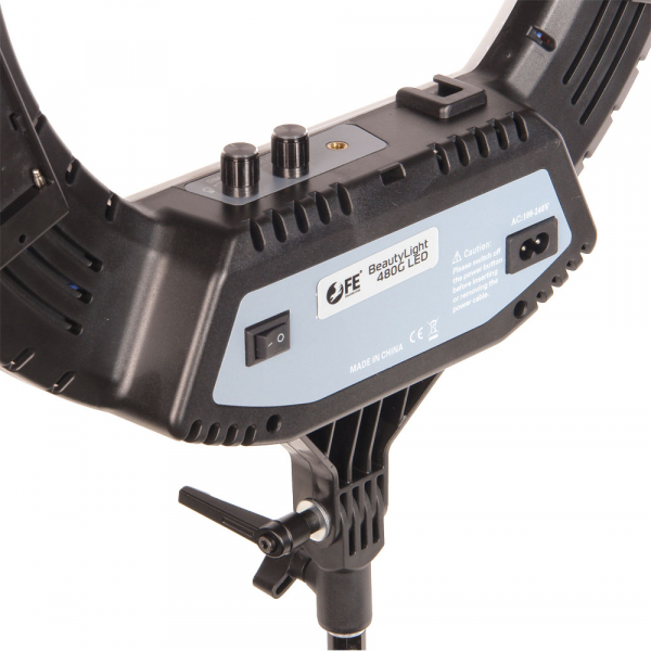 Осветитель кольцевой Falcon Eyes BeautyLight 480G LED Светодиодный осветитель BeautyLight 480G LED лёгкий и компактный осветитель с источником света в виде кольцевой панели со светодиодами, с регулируемой мощностью светового потока и цветовой температурой. Для использования визажистами, гримёрами и стилистами важную роль играют бестеневой характер и возможность настройки цветовой температуры освещения. Небольшие размеры осветителя и низкий уровень потребляемой светодиодами мощности делают этот осветитель привлекательным также для использования в студии для портретной, предметной, рекламной и других видов фотосъемки. Корпус осветителя изготовлен из прочного ABS пластика. Под белым молочным рассеивателем находятся 480 ярких светодиода. На обратной стороне находятся тумблер включения/выключения питания, два гнезда для установки аккумуляторов N-PF, разъём для подключения к сети, регуляторы яркости и цветовой температуры, а также 4 холодных башмака для установки дополнительного оборудования (штанги, держатели для смартфонов, микрофонов и пр.). Дополнительно на корпусе осветителя предусмотрены два отверстия с резьбой 1/4'' для установки аксессуаров с резьбовым креплением. Яркость и цветовая температура меняются бесступенчато. Для установки на стойку (с посадочным диаметром пальца 15 мм) служит шарнир, который позволяет наклонить осветитель на угол до 90° в обе стороны и зафиксировать его в этом положении при помощи винтового фиксатора.