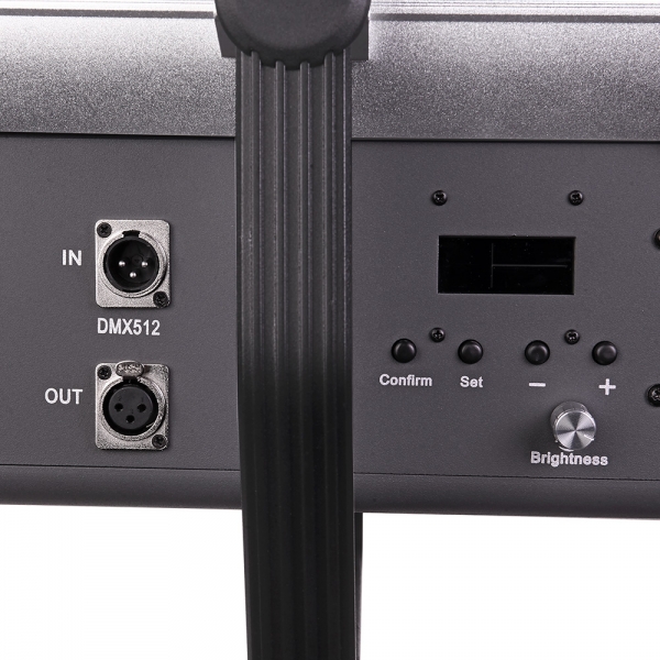 Данный осветительный прибор поддерживает технологию DMX управления. Основное преимущество управлением света по DMX технологии - это возможность программирования любой сложности сценариев освещения и передача сигнала на большие расстояния (до 100 м) без потери мощности. Осветитель оборудован DMX декодером, адрес канала устанавливается кнопками на панели управления и отображается на ЖК дисплее.