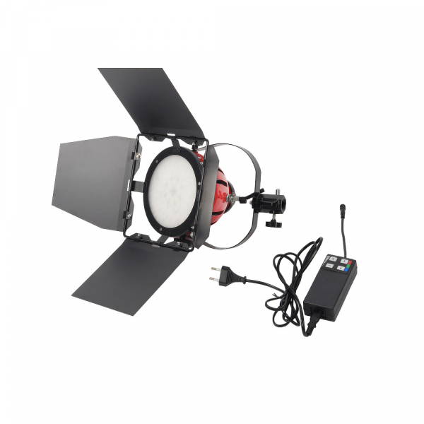 Осветитель светодиодный Falcon Eyes DTR-30 RGB LED Falcon Eyes DTR-30 RGB LED — компактный и надежный светодиодный осветитель с металлическими съёмными шторками, регулировкой яркости и возможностью реализации любого цветового оттенка, благодаря смешиванию основных трёх цветов — красного, зелёного и синего. Питание и регулировка мощности и выбор цвета осуществляется от комплектного блока питания со встроенным диммерами. Максимальная мощность 36 Вт. Осветитель студийный Falcon Eyes DTR-30 RGB LED можно использовать как источник заливающего света в студии, для подсветки фонов и т. д. Фактически является альтернативой цветным гелевым фильтрам, устанавливаемые на студийные осветительные приборы для получения эффектных выразительных кадров с необыкновенным цветовым решением. Конструкция Корпус осветителя, лира и шторки изготовлены из стали. Круглая (диаметр 160 мм) светодиодная панель с 80-ю RGB светодиодами расположена за матовым светорассеивателем. Шторки крепятся на корпусе осветителя и фиксируются на нём винтом, имея возможность вращаться при необходимости на 360º. Шторки отсекут световой поток, сформируют его нужную форму и размер, не допустят паразитных засветок при съёмке. Установка осветителя осуществляется на стандартную стойку со шпиготом 5/8 дюйма. Лира позволяет наклонять и поворачивать осветитель на стойке. Для страховки при установке осветителя в перевёрнутом положении (например при монтаже на потолочную систему) в основании лиры предусмотрен подпружиненный предохранитель. Питание и управление Питание, регулировка мощности и выбор цвета осуществляется от выносного блока питания (длина кабеля около 190 см) со встроенным диммерами. На корпусе блока питания расположены две пары кнопок: «+», «-». Одна пара управляет яркостью светового потока, вторая пара управляет цветом. Регулировка яркости и оттенка цвета — бесступенчатые. Поиск нужного цвета производится следующим образом: пользователь выбирает направление изменения цвета, удерживая одну из кнопок диммера (например «+»), происходит плавное изменение цвета от красного (по умолчанию при включении) до глубокого синего. В процессе поиска пользователем необходимого ему цветового оттенка, каждый из RGB светодиодов «горит» с разной мощностью, обеспечивая, таким образом практически полную палитру существующих в природе цветов. Подключение блока питания осуществляется через фасонный штекер, расположенный у корпуса прибора.