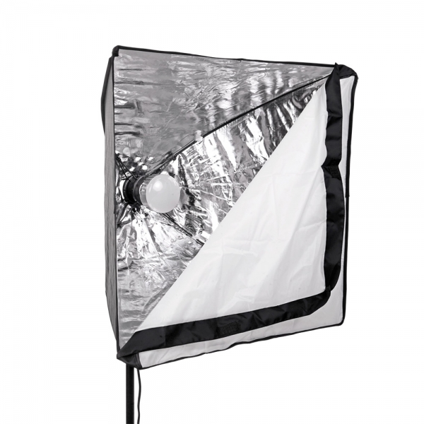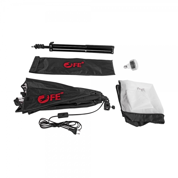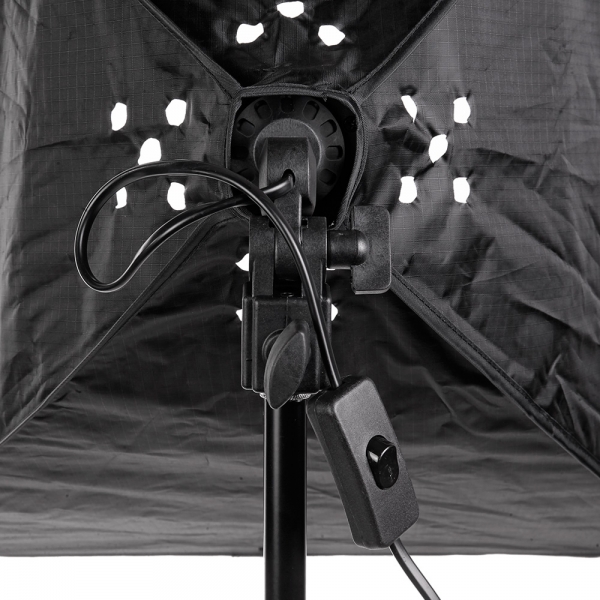 Осветитель оборудован патроном стандарта Е27, в который устанавливаются светодиодная лампа. На электрокабеле находится выключатель. Осветитель питается от сети 220 В и имеет стандартный разъем для установки на стойки с креплением 5/8". Осветитель можно использовать самостоятельно или вместе с софтбоксом 50х50 см из комплекта поставки.