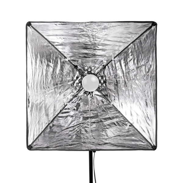 В комплект входит прямоугольный световой модификатор размером 50х50 см, поддерживаемый 4 стальными спицами, которые устанавливаются в осветитель KeyLight 130 и формируют монолитную конструкцию. Внутри софтбокса находится фактурная серебристая ткань, спереди на липучки крепится рассеиватель. Софтбокс создает мягкое рассеянное освещение без резких теней. Входящий в комплект софтбокс предназначен для использования только с осветителем KeyLight 130 и светодиодными лампами.