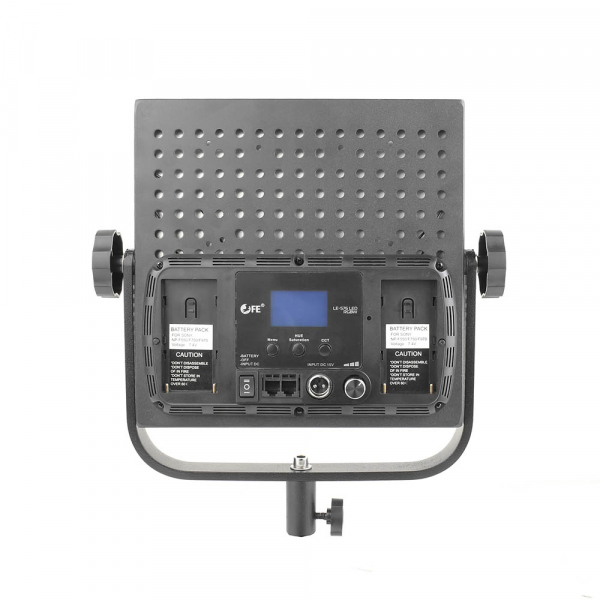 Корпус осветителя и лира изготовлены из прочного алюминиевого сплава. На передней части расположены 4 складывающиеся металлические шторки и белый матовый несъёмный светорассеиватель. На задней части расположена панель управления осветителем: ЖК экран с подсветкой, кнопки выбора режимов, валкодер, разъём питания, трёхпозиционный тумблер питания, разъёмы DMX (RJ-25) и два гнезда для подключения аккумуляторов типа NP-F. Протокол DMX-512 позволяет подключать и объединять в группы не только осветители Falcon Eyes LE-576 LED RGBW, но и различные устройства других производителей (прожекторы, осветители и т.д.) к пульту управления (существуют и беспроводные передатчики и приемники для управления по DMX). Установка осветителя производится на любую стойку со шпиготом 5/8 дюйма. Фиксация осветителя на шпиготе — винтовая. Осветитель на лире можно вращать на угол до 180°, его положение фиксируется двумя винтами с обеих сторон лиры.