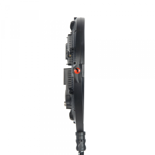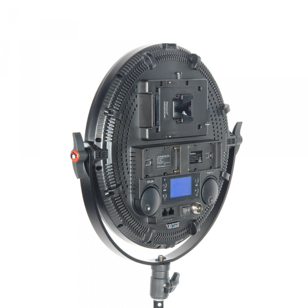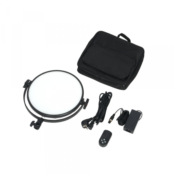 Осветитель светодиодный GreenBean MoonLight 120 LED bi-color Мощный светодиодный осветитель GreenBean MoonLight 120 LED bi-color - круглая световая панель с изменяемой цветовой температурой. Источники света — 600 ярких SMD светодиодов с высоким уровнем цветопередачи (CRI более 95). Максимальная мощность — 67 Вт. В отличие от традиционно используемых софтбоксов, осветитель GreenBean MoonLight имеет абсолютно круглую матовую (через которую не видны излучающие светодиоды) поверхность, малые габариты и может создавать красивые круглые блики на глянцевых отражающих поверхностях. В осветителе используется две группы светодиодов с температурой 3200 К и 5600 К, каждая номинальной мощностью 60 Вт. Электрическая схема блока питания осветителя ограничивает общую мощность световой панели величиной 67 Вт. Установив (зафиксировав) необходимую мощность панели (максимум 67 Вт), пользователь может плавно менять цветовую температуру. Регулировка мощности бесступенчатая — от 10 до 100% Конструкция Корпус осветителя изготовлен из ударопрочного ABS пластика, на передней части корпуса расположен белый молочный светорассеиватель диаметром 28 см. На задней части корпуса расположены элементы управления осветителем, LCD экран с подсветкой, разъёмы DMX тип RJ45, разъём питания, разъёмы для установки аккумуляторов и тумблер питания. Протокол DMX-512 позволяет подключать и объединять в группы не только осветители GreenBean MoonLight 120 LED bi-color, но и различные устройства других производителей (прожекторы, осветители и т.д.) к пульту управления (существуют и беспроводные передатчики и приемники для управления по DMX). Сверху на корпусе расположен «холодный» башмак для установки аксессуаров (приобретаются отдельно): например, микрофонов, держателей для смартфонов и т. д. . Лира осветителя изготовлена из алюминиевого сплава. Осветитель может наклоняться на лире на угол 180° и фиксироваться в этом положении с помощью двух винтовых зажимов по обеим сторонам. Установка осветителя осуществляется на стандартную стойку со шпиготом 5/8 дюйма; предусмотрена возможность горизонтальной установки лиры осветителя. Фиксация лиры на стойке — винтовая. Активная система охлаждения с бесшумными вентиляторами не создаёт помех при звукозаписи и допускает длительную работу осветителя без необходимости делать перерывы во время съёмки для его «остывания». Дистанционное управление Для дистанционного управления осветителем, в комплекте с ним предусмотрен пульт 2.4 ГГц. С помощью него можно настраивать мощность и цветовую температуру, а также выбирать канал управления или полностью отключать питание прибора Текущие параметры работы отображаются на экране. Питание пульта осуществляется от 2-х батареек типа «ААА». Два варианта питания осветителя В студии: комплектный блок питания с сетевым кабелем. На выезде: возможно подключение аккумуляторов NP-F (питание осуществляется только от двух аккумуляторов одновременно) или V-mount. Для длительной автономной работы, можно установить все три аккумулятора. Аккумуляторы NP-F и V-mount приобретаются отдельно. Выбор источника осуществляется трёхпозиционным тумблером на корпусе осветителя. Сумка-чехол Для хранения и транспортировки в комплекте предусмотрена сумка-чехол на молнии.
