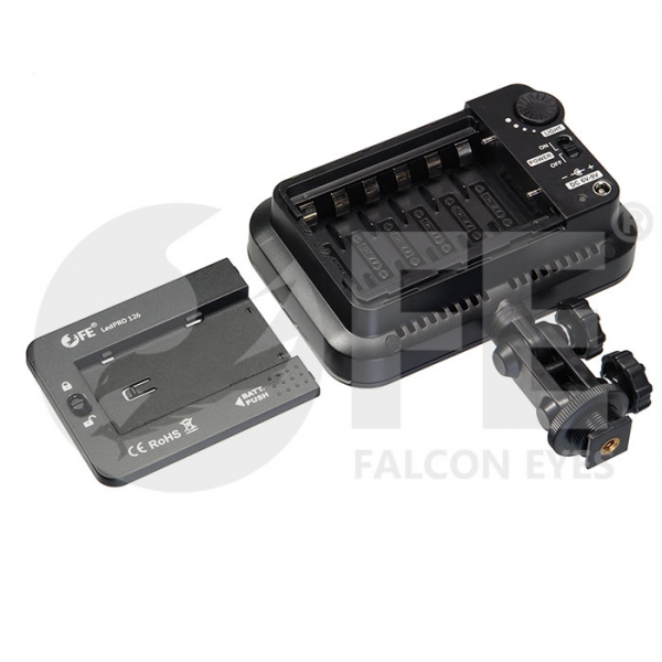 Falcon Eyes LedPRO 126 легкий и компактный светодиодный накамерный осветитель с наклонным кронштейном. 126 высокоэффективных светодиодов генерируют мягкий световой поток без мерцаний с цветовой температурой 5500К ±200К. Технология производства светодиодов обеспечивает визуально точную цветовую температуру без искажений даже при уменьшении яркости. Осветитель предназначен для использования в фото- и видеосъемке, макросъемке, предметной съемке и других видах съемок. Наклонный кронштейн На корпусе устройства смонтирован двухколенный кронштейн, который позволяет выдвигать осветитель вперед и регулировать его наклон. Поворотные узлы кронштейна зажимаются через зубчатое соединение, что препятствует проскальзыванию. Фильтры в комплекте Осветитель комплектуется конверсионным фильтром, понижающим цветовую температуру с 5500К до 3200К, и белым рассеивающим фильтром (диффузором). Равномерный световой поток Световой поток смягчается встроенным несъемным диффузором. За светодиодами расположена специальная отражающая панель, которая делает распределение лучей более равномерным, существенно улучшая свойства потока. В световом пятне отсутствуют резкие границы и перепады освещенности. Плавная регулировка яркости Мощность осветителя регулируется диммером, расположенным на задней панели прибора. Бесступенчатый регулятор позволяет изменять интенсивность света от 10% до 100% без сдвига цветовой температуры. Универсальное питание Под крышкой задней панели прибора находится отсек для 6 батарей типа АА. Также осветитель можно подключить к сетевому источнику питания с напряжением 6-9В или использовать аккумулятор типа NP-F (адаптер, батарейки и аккумулятор приобретаются отдельно).