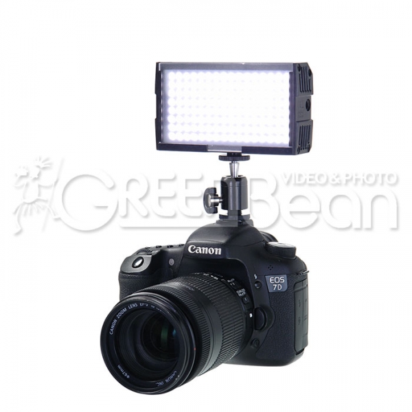 Осветитель светодиодный накамерный GreenBean LuxMan 128 LED Накамерный осветитель LuxMan 128 LED, благодаря широкоформатным пропорциям корпуса (124х70 мм), обеспечивает равномерное освещение при видеосъемке без падения яркости по краям кадра. В качестве источника света используются новые светодиоды с индексом цветопередачи CRI >90, которые позволяют передать точные цвета снимаемого объекта, а световой поток достигает 900 лм. Цветовая температура осветителей 5500 К (3200 К с фильтром). В комплекте аккумулятор 2100 мАч типа NP-F и сетевой адаптер. Аккумулятор обеспечивает 2-3 часа непрерывной работы, а для более продолжительных съемок осветитель можно подключить к сети 220 В с помощью адаптера (9 В 2,5 А). На задней панели устройства находится диммер, который позволяет плавно регулировать яркость в пределах 10-100%. Прочный алюминиевый корпус с порошковым покрытием защитит осветитель от ударов при транспортировке. Благодаря крепежному адаптеру с шаровым основанием, установленный на камере осветитель можно наклонить или повернуть в нужном направлении.