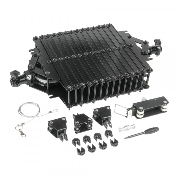 Пантограф Falcon Eyes # 3335 Пантограф Falcon Eyes #3335 предназначен для крепления осветительных приборов и другого оборудования (генераторы тумана, снега, мыльных пузырей) на потолочной подвесной системе Falcon Eyes А 3303. Пантограф изготовлен из алюминиевого сплава и при своих габаритах весит всего около 7 кг. Толщина рычагов пантографа 3 мм. Шарниры изготовлены из стали. Крепление Крепление к верхней каретке и крепление оборудования к пантографу осуществляется стальным пальцем диаметром 5/8 дюйма (16 мм) и имеет защитный винт исключающий выпадение пальца каретки. Дополнительно, оборудование на пантографе страхуется от падения стальным тросиком (Д=2 мм) с металлическим карабином. Амортизатор Возможность регулировки амортизатора позволяет настроить нагрузку от 0 до 15 кг. Для обеспечения плавности движений установленного оборудования, необходимо настроить упругость амортизатора в зависимости от массы груза (если нагрузка большая, амортизатор должен быть жестким; в противном случае, амортизатор должен быть ослаблен). Регулировка осуществляется комплектным ключом. Ролики для подвесной потолочной системы Нейлоновые колеса на стальной оси выдерживают большие нагрузки. Плавность хода обеспечивается подшипниками качения. Для безопасного использования в конструкции предусмотрен механизм торможения. Надежность и долговечность подвижных частей пантографа обеспечивают стальные шарниры, отсутствие пластика в элементах несущих нагрузку, металлические заклепки, увеличенная толщина металла рычагов пантографа, подшипники качения в конструкции верхней каретки, долговечный материал роликов.