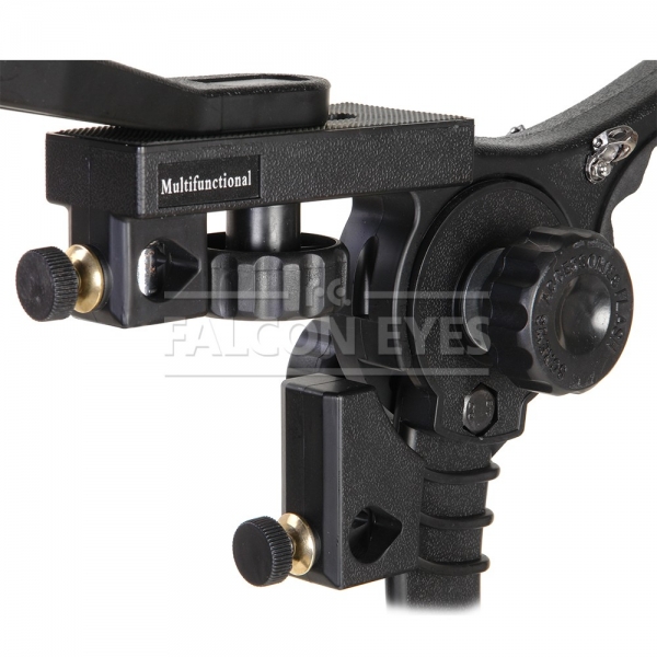 Легкий, компактный (в сложенном положении) наплечный штатив для фото и видеосъемки. Благодаря использованию жесткого и прочного инженерного пластика, металлических осей, в статике он выдерживает нагрузку до 5 кг. Однако, с учетом рывков и толчков, возникающих при съемке в движении, его не рекомендуется использовать с аппаратурой весом более 1,5 кг. Конструкция представляет из себя «коромысло» — задняя часть которого является наплечником с мягкой резиновой вставкой, а передняя — несущей площадкой для крепления подвижного узла с установочным местом для камеры и осветителя (микрофона). Этот подвижный узел может поворачиваться в пределах 180 градусов, а также передвигаться вдоль по несущей площадке «коромысла» в пределах 25 мм. Выбранное положение фиксируется нижним прижимным винтом. К оси «коромысла» закреплен нижний (подвижный, подпружиненный) изогнутый рычаг — для упора в грудь оператора. Его положение фиксируется любым из двух зажимных винтов — слева и справа от оси. В штативе имеются два посадочных места для установки конструкции на стойку с наконечником 5/8 дюйма (с зажимными винтами и бронзовыми вставками). В комплекте — широкий, мягкий ремень с пластиковым карабином.