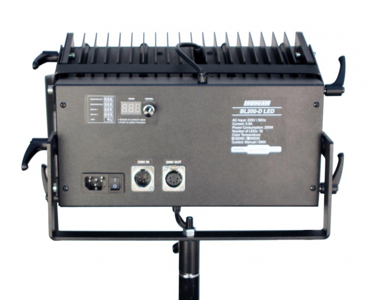 Светильник предназначен для фонового и заполняющего света на выезде и в студиях. Уникальная конструкция содержит две светодиодные панели, которые можно фиксировать под любым углом друг к другу и относительно корпуса, независимо регулировать яркость каждой панели. Эта особенность в сочетании с широким углом расхождения светового пучка обеспечивает максимальную равномерность при освещении фона. Вынесенные наружу радиаторы обеспечивают эффективное охлаждение и долговечность устройства. Встроенный DMX-блок позволяет управлять яркостью панелей светильника как удаленно с пульта DMX, так и с помощью ручки управления, расположенной на осветительном приборе. При этом на цифровом табло отображается либо яркость (в процентах от максимальной), либо номер канала DMX. Низкое энергопотребление и мощный световой поток позволяют применять такие светильники даже при ограничении на потребление электроэнергии. Все эти особенности прибора открывают перед художником по свету новые возможности и позволяют добиться идеального освещения поверхности фона или объекта съемки.