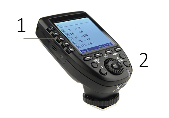 Большой ЖК дисплей, 5 кнопок групп и 4 функциональных кнопки обеспечивают удобство манипуляций. Кнопки групп (1), Функциональные кнопки (2) Обновление прошивки через USB разъем типа С. Беспроводная синхронизация через гнездо для синхрокабеля 2,5мм. USB разъем тип C (1), Гнездо для синхрокабеля 2,5мм (2) *2 батарейки АА Большая портативность Xpro-O – его вес всего 80 г.