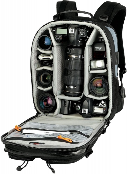 Вместимость Lowepro Vertex 200 AW: 1-2 профессиональные камеры или среднеформатная система; 4-6 объективов до 300 мм F/2.8, штатив, вспышка и электронные аксессуары. Размер отделения под ноутбук: 30х5х42 см. Система регулируемых плечевых ремней эргономичная, подгоняется под индивидуальные потребности и благодаря этому значительно снижает нагрузку на позвоночник даже при полной загрузке рюкзака. Два внешних передних кармана позволяют хранить все аксессуары в одном месте. Специальный крепежный механизм позволяет закрепить штатив: трипод, монопод или ледоруб.