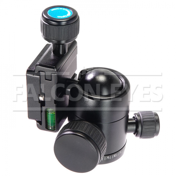 Falcon Eyes ВН-25 — шаровая штативная голова с быстросъемной площадкой, изготовлена из алюминиево-магниевого сплава, предназначена для установки камер с креплением 1/4" и весом до 10 кг. Особенностью шаровой головы является возможность контролировать все три оси движения и фиксировать положение одним замком. При небольшом собственном весе — всего 295 г, обладает высокой прочностью, прецизионным исполнением и выдерживает нагрузку до кг. Голову BH-25 можно использовать с любыми штативами, моноподами или другими опорами, имеющими установочный винт диаметром 3/8". Нижняя база головки снабжена поворотным механизмом с независимым фиксатором положения и шкалой для горизонтального панорамирования. Также на базе расположен фиксатора шара, который управляет всеми положениями головки. Вращение рукояток плавное с дозированным усилием, а фиксация быстрая и надежная. Установив усилие зажима на близком к максимальному уровню, вращение шара происходит плавно и без «рывков».