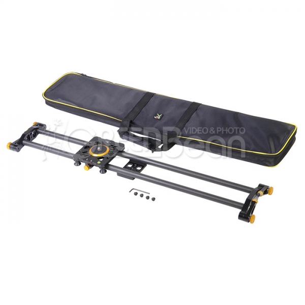 Слайдер GreenBean Glide Track 80 Green Bean Glide Track 80 - легкий и прочный слайдер (глайдтрек) с карбоновыми направляющими для камер весом до 6 кг. Применяется в видеопроизводстве для съемки рекламных роликов, презентационных фильмов, свадебных клипов и другой видеопродукции. Слайдер предназначен для съемки с движущейся точки, установленная на каретке камера плавно передвигается по рельсовым направляющим. Прецизионно изготовленные ролики обеспечивают исключительно плавное движение каретки. Каретка опирается на направляющие с помощью 4 внешних роликов и 2 регулируемых внутренних роликов на подвижном основании, такая конструкция позволяет выбрать зазоры для полного устранения люфта. Опорные ролики изготовлены из прочного полимерного материала. На оси каждого ролика находятся два радиально упорных безлюфтовых подшипника повышенной грузоподъемности, которые не требуют дополнительной смазки. На каретке находится винт диаметром 1/4" (в комплекте переходник 3/8") и отверстия с резьбой диаметром 1/4" и 3/8" для установки вспомогательного оборудования. Сверху на каретке расположен пузырьковый уровень, который поможет выставить слайдер по горизонту. Винтовой фиксатор позволит зафиксировать каретку в определенном положении, а резиновые упоры на торцах каретки предотвратят жесткие удары в крайних положениях. На направляющих снизу в центре расположена монтажная площадка для установки на штатив, на пластине имеются 2 резьбовых отверстия диаметром 1/4" и 3 отверстия диаметром 3/8". Также возможна установка на два штатива, для этого снизу на торцах слайдера имеются отверстия с резьбой диаметром 1/4" и 3/8". Ножки слайдера регулируются по высоте и поворачиваются на 360˚ вокруг оси крепления. Ножки соединяются с основанием с помощью зубчатой муфты, препятствующей проскальзыванию. В узле крепления ножки находится прижимная пружина, если ослабить зажим, то ножка не потеряет своего положения, но позволит отклонить ее ступенчато через зубчатый механизм. На концах ножек расположены вывинчивающиеся на 15 мм наконечники с резиновой опорой.