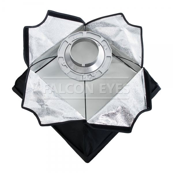 Софтбокс Falcon Eyes Установленный на приборе софтбокс можно поворачивать на 360 градусов, выбранное положение фиксируется винтом на адаптере. Внешний и внутренний рассеивающие экраны изготовлены из синтетических материалов. Закрытая конструкция позволяет избежать нежелательных бликов и потерь светового потока. Отражатель, с серебристой тканью внутри, обеспечивает равномерную засветку рассеивателя, который в свою очередь, благодаря большой поверхности, смягчает формируемые тени. Дополнительный внутренний диффузор улучшает равномерность светового потока. Наконечники на упругих металлических спицах не повреждают тканевые спицедержатели софтбокса и облегчают сборку конструкции. В комплекте чехол для хранения.