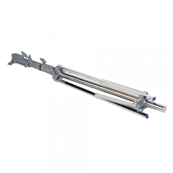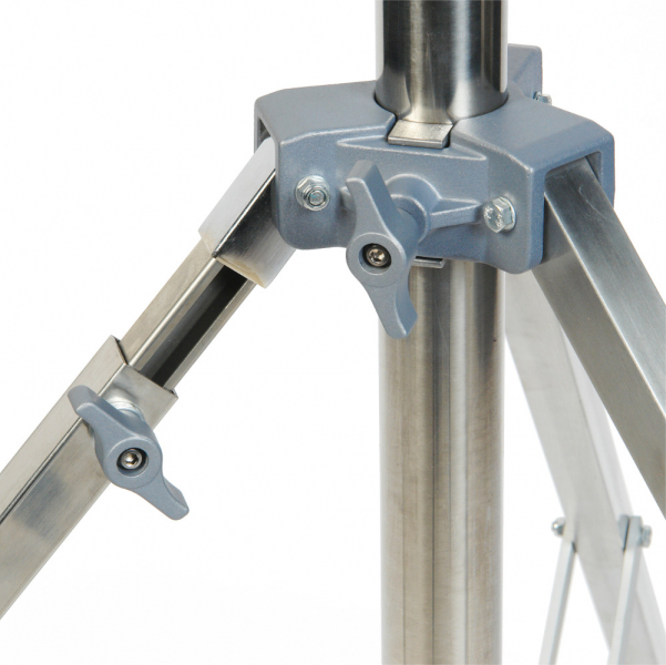 • Прочные ножки из прямоугольного стального профиля (26 х 26 мм) обеспечивают устойчивое положение стойки на любой поверхности. Благодаря пластиковым насадкам они не царапают пол. Одна из ног – телескопическая (длина увеличивается на 25 см). Это дает возможность использовать стойку на поверхности с перепадом высот, например на лестнице, или наклонить ее под нужным углом, если дополнительно укомплектовать подходящим противовесом.