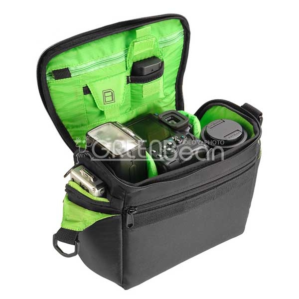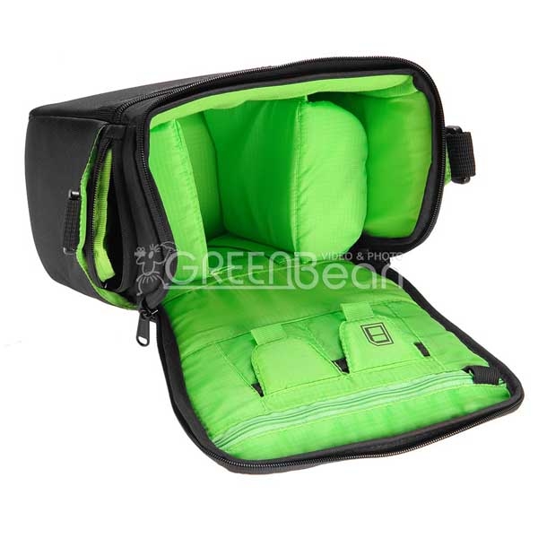 Сумка GreenBean Guardian 02, средняя из серии, вмещает в себя зеркальную камеру с штатным объективом, 1–2 дополнительных объектива, вспышку и аксессуары. Упругий вспененный материал обшитый износоустойчивым нейлоном и вельветовое внутреннее покрытие защитит оборудование от климатических воздействий, царапин и повреждений. Регулируемая по длине лямка с мягким наплечником и широкая ручка обеспечат комфортную эксплуатацию. Двухзамковая молния для быстрого доступа к содержимому. Сумка снабжена креплением для размещения на телескопической ручке чемодана или тележки. Основной отсек для техники имеет регулируемые перегородки на липучках, благодаря этому пространство внутри рюкзака можно настроить под необходимое оборудование. Внутри расположены два кармана на липучках и карман на молнии, в них можно разместить карты памяти, батарейки, светофильтры