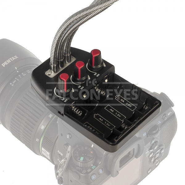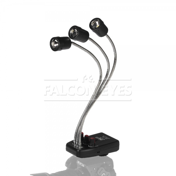 Falcon Eyes DV-3B — накамерный светодиодный осветитель для точечной подсветки, предназначен для использования в макросъемке . Осветитель состоит из 3-х отдельно регулируемых ламп-светодиодов мощностью 1 Вт каждая. Светодиоды закреплены на длинных гибких металлических штангах. Блок управления (основание) устанавливается на камеру с помощью крепления «холодный башмак», башмак снизу имеет бронзовую вставку с резьбой 1/4 дюйма для установки осветителя на штатив. С помощью 3-х ручек производится независимая плавная регулировка яркости каждого светодиода от 0 до 100%, а также включение/отключение питания. Угол освещения регулируется от 53° до 120°, в комплекте насадки для создания направленного узкого потока света. С помощью гибких штанг длиной 330 мм можно легко перемещать диоды в любое положение для достижения требуемого эффекта освещения. Для создания цветовых эффектов применяются сменные светофильтры из комплекта. В качестве элементов питания используются 4 батареи типа АА или соответствующие аккумуляторы (не входят в поставку).