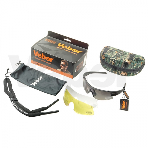 Veber Tactic Force L3P3 - баллистические стрелковые противоосколочные очки с быстросменными ударопрочными поликарбонатными линзами. Очки предназначены для защиты органов зрения от ультрафиолета, ветра, пыли, а также попадания крупных частиц во время активного отдыха и занятия экстремальными видами спорта, при стрельбе в тире, на охоте или проведении тактических учебных операций. Подходят для повседневного использования. Цвет оправы – черный. Очки комплектуются тремя сменными линзами (бесцветные, темно-серые и желтые), жестким футляром на молнии, чехлом и фирменным регулируемым шейным ремешком.