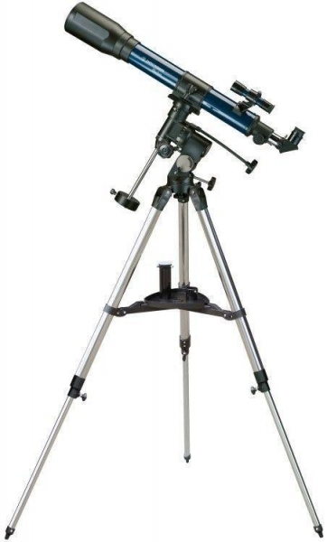 Телескоп Bresser Jupiter 70/700 EQ – небольшой рефрактор, установленный на экваториальной монтировке. Высококачественная оптика обеспечивает яркое и контрастное изображение, а удобная монтировка отлично подходит для астрономических наблюдений. Такой телескоп будет хорошим подарком для любознательного подростка, он позволит начинающему любителю познакомиться со звездным небом и получить базовые навыки работы с телескопом. Он позволит увидеть множество подробностей на поверхности Луны, кольца Сатурна и спутники Юпитера, наблюдать двойные и кратные звезды, звездные скопления, самые яркие туманности и галактики и множество других объектов. Объектив этого телескопа – длиннофокусный ахромат с полным многослойным просветлением. Благодаря малому относительному отверстию сведено к минимуму влияние хроматических аберраций на качество изображения, а просветляющее покрытие уменьшает потери света в оптике телескопа, что способствует повышению яркости и контрастности изображения. Объектив снабжен съемной блендой, которая предотвращает блики от локальных источников засветки и защищает линзы от запотевания. Телескоп снабжен фокусером реечного типа. Фокусировка плавная, без рывков и люфтов. Посадочный диаметр под окуляры составляет 1,25”, что позволяет использовать большое количество дополнительных аксессуаров. На трубе установлен искатель с большим полем зрения, использование которого существенно облегчает наведение на объекты. В комплекте поставки имеется все необходимое для наблюдений: три сменных окуляра и линза Барлоу позволяют подобрать оптимальное увеличение для любых видов наблюдений, а диагональное зеркало облегчает наблюдение околозенитных областей. Также в комплекте имеется компакт-диск с астрономической программой-планетарием, которая поможет вам оптимальным образом спланировать ваши наблюдения. Телескоп устанавливается на экваториальной монтировке немецкого типа. Такая монтировка наилучшим образом подходит для астрономических наблюдений – она позволяет компенсировать суточное вращение небесной сферы вращением оптической трубы телескопа вокруг одной оси, что облегчает ведение телескопа. Монтировка снабжена механизмами тонких движений по обеим осям. Она имеет ручное управление, но есть возможность установки электропривода часовой оси для компенсации суточного вращения небесной сферы. Монтировка установлена на алюминиевом штативе регулируемой высоты, который позволяет работать с телескопом человеку любого роста. Штатив снабжен удобной полочкой для аксессуаров.