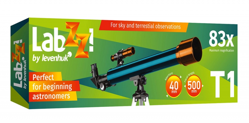 Телескоп Levenhuk LabZZ T1 можно порекомендовать в качестве первого телескопа для любознательного ребенка. Это рефрактор с высококачественной оптикой, который дает возможность изучать лунную поверхность, исследовать марсианские кратеры, наблюдать вихри на Венере. Благодаря диагональному зеркалу, которое правильно ориентирует изображение и включено в комплект поставки, телескоп можно использовать как зрительную трубу для наблюдения наземных объектов. Рефрактор Levenhuk LabZZ T1 прост в управлении. Он установлен на азимутальную монтировку, управление которой не требует знаний и навыков. На ее освоение у ребенка уйдет не более нескольких минут. Тренога изготовлена из алюминия. Высота треноги регулируется. В комплект поставки включены два окуляра разной кратности и оборачивающий окуляр. Максимальное увеличение «из коробки» составляет 83 крат. Такого увеличения хватит для раскрытия множества интригующих тайн космоса.