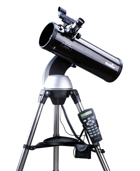 В оптической схеме используется параболическое главное зеркало. Оно фокусирует все падающие на него световые пучки в одной точке. Таким образом, телескоп формирует яркое и чистое изображение, свободное не только от хроматизма, но и от сферических аберраций. Данная модель комплектуется двумя окулярами – для обзорных наблюдений и для подробного изучения астрономических объектов. Монтировка Оптическая труба устанавливается на азимутальную монтировку. Моторные приводы по обеим осям обеспечивают плавное перемещение трубы. Удобный пульт отличается интуитивно понятным интерфейсом. В базе данных монтировки содержатся координаты 42 900 небесных тел. Чтобы начать наблюдения, пользователю нужно выбрать любое из них и нажать на кнопку на пульте. Телескоп автоматически найдет выбранный объект, наведется на него и будет следовать за ним в течение всего времени наблюдения. Устойчивая тренога гарантирует стабильное положение телескопа. Тренога снабжена лотком для аксессуаров.