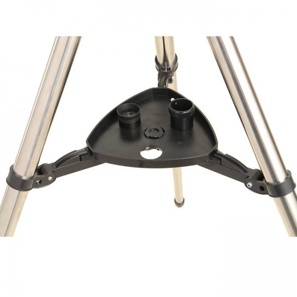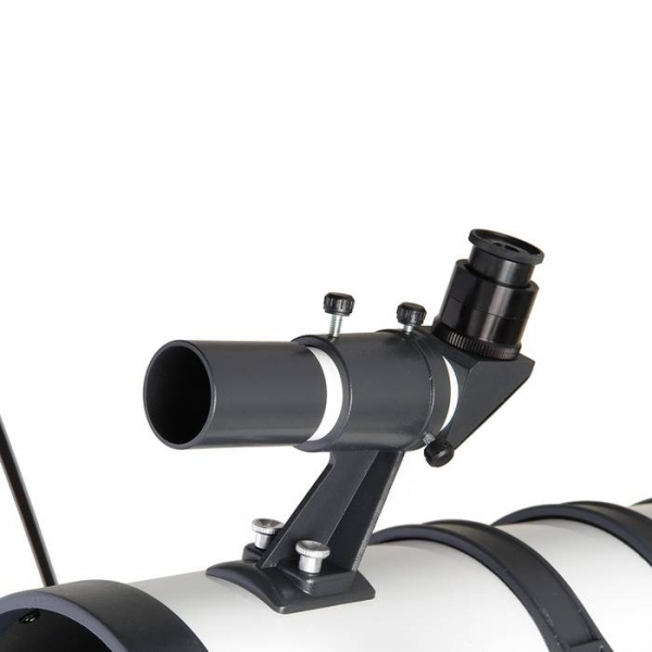 Телескоп Veber Polarstar 1000/114 EQ — оптимальная модель для серьезных, но начинающих любителей астрономии. Зеркало диаметром 114 мм достаточно велико, чтобы собирать много света (в этот телескоп вы сможете увидеть объекты солнечной системы во всех подробностях — таких как щель Кассини в кольце Сатурна, лунные кратеры размером ок.5 км, слабые звезды до 13 m зв. величины). Однако, габариты прибора вполне «домашние», длина трубы всего 42 см. С окуляром PL25 вы получите увеличение 40х, с которым удобно вести наземные наблюдения. При этом ближняя точка фокусировки составит всего 12 м. Очень стильное исполнение телескопа: белая глянцевая металлическая труба в обрамлении выглядящих брутально крышек, металлическая монтировка с декоративными оранжевыми элементами, мощный штатив из полированной нержавейки… Удобный 90 градусный искатель (увеличение 6х) расположен рядом с окуляром. Прибор оснащен монтировкой немецкого типа EQ5 с возможностью подключения электропривода (для постоянного наблюдения за выбранным объектом). Многие другие фирмы, в целях удешевления, устанавливают такие телескопы на монтировку EQ1, которая является для них откровенно слабой. Вся конструкция: