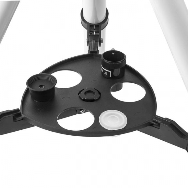 Телескоп Veber 700*70 Эк. Белый - это линзовый телескоп (рефрактор), который дает четкое и контрастное изображение, хорошо подходит для путешествий. Просветленный ахроматический объектив с диаметром 70мм, собирает в два раза больше света, чем 50мм и позволяет наблюдать не только небесные, но и очень удаленные земные объекты. Картинка резкая, без окрашенности изображения по краю поля зрения. В этот телескоп вы сможете увидеть детали на дисках планет, кратеры Луны размером 5-6 км, многие туманности и звездные скопления (вплоть до 12 m звездной величины). Для земных наблюдений мы рекомендуем использовать окуляр PL-20, с которым увеличение телескопа будет 35x, при этом ближняя точка фокусировки составит 12,5 м. Обратите внимание, этот телескоп дает прямое (не перевернутое) изображение. Кроме того, наличие в окулярном блоке 45 градусной оборачивающей призмы Шмидта (а не диагонального зеркала, как в аналогичных моделях других фирм), делает изображение изображение не зеркальным (где левое и правое меняются местами), а таким, каким вы видите его невооруженным глазом. Для удобства наблюдения (из положения стоя или сидя), окулярную часть вместе с призмой можно поворачивать, 8 фиксированных положений. С помощью искателя (входит в комплект, увеличение 6х, крепится к телескопу) можно быстро навестись на цель наблюдения. Телескоп снабжен экваториальной монтировкой EQ2 без единой пластиковой детали с возможностью микрометрического наведения телескопа по обеим осям. Два слова о том, как ей пользоваться: одна из осей экваториальной монтировки устанавливается параллельно оси вращения Земли, благодаря этому суточное вращение неба может быть компенсировано вращением телескопа вокруг только одной оси монтировки, но в сторону, противоположную вращению Земли. Иными словами, "вести звезду" вы можете вращая только одну рукоятку наведения (более подробно см. инструкцию). Телескоп поставляется с алюминиевым штативом с возможностью регулировки высоты. Распорки для ножек служат не только для повышения устойчивости, но и в качестве подставки под полочку для аксессуаров (идет в комплекте). Сумка для переноски, в которую укладывается весь комплект, позволяет безопасно (для оптики и внешнего вида) транспортировать прибор для выездов на природу или при походах в гости.