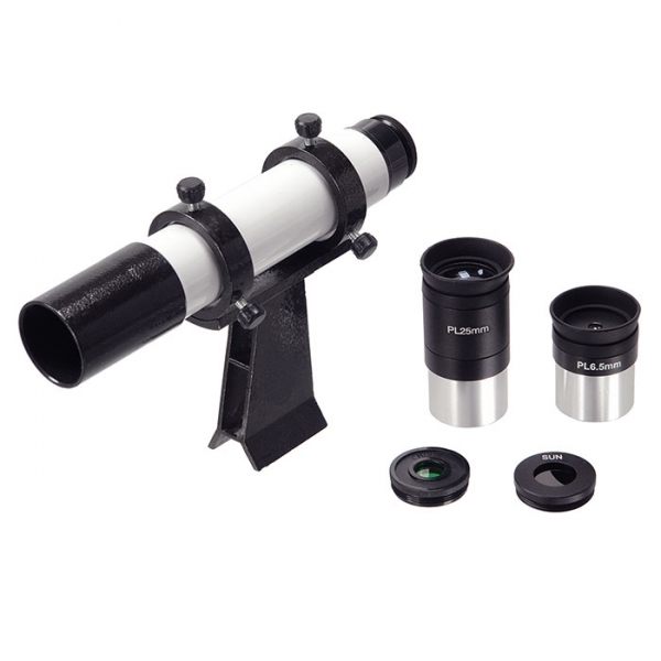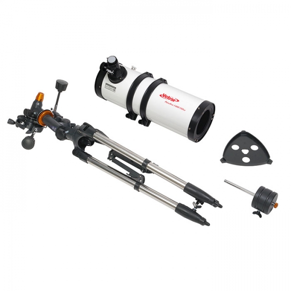 Качественный телескоп для начинающих и продвинутых астрономов. Оснащен монтировкой EQ5 с возможностью установки механизма электропривода (для постоянного наблюдения за выбранным объектом). Он собирает на 70% больше света, чем прибор с диаметром зеркала 114 мм. Вы увидите в него детали лунных гор и кратеров размером 3–4 км, Венеру, Уран, мелкие детали в облачной структуре Юпитера. Ему доступны неяркие звезды, до 14 m звездной величины. Длина трубы 53 см. Комплектуются окулярами PL (Плессла). С учетом габаритов, оптимальная монтировка для него — EQ5 (некоторые фирмы аналогичные телескопы устанавливают на монтировки EQ2 или даже EQ1, которые значительно дешевле. Это неоправданная экономия. Какого бы хорошего качества не была картинка, но если она дрожит чуть ли не от взмаха ресниц над окуляром и не успокаивается целую минуту, то удовольствие от таких наблюдений равно нулю). Данная монтировка EQ5 может быть дополнена механизмом электропривода (для постоянного наблюдения за выбранным объектом). «Апгрейду» подлежит и сам телескоп. Доступны: универсальный адаптер для 35 мм фотоаппарата, светофильтры, окуляры разных конструкций и др. Очень стильное исполнение телескопа: белая глянцевая металлическая труба в обрамлении выглядящих брутально крышек, колец и деталей монтировки немецкого типа EQ5 с декоративными оранжевыми элементами. Удобный искатель (увеличение 6х) расположен рядом с окуляром. Мощный, красивый, устойчивый штатив из полированной нержавеющей стали с дополнительными распорками, на которые устанавливается полочка для аксессуаров.